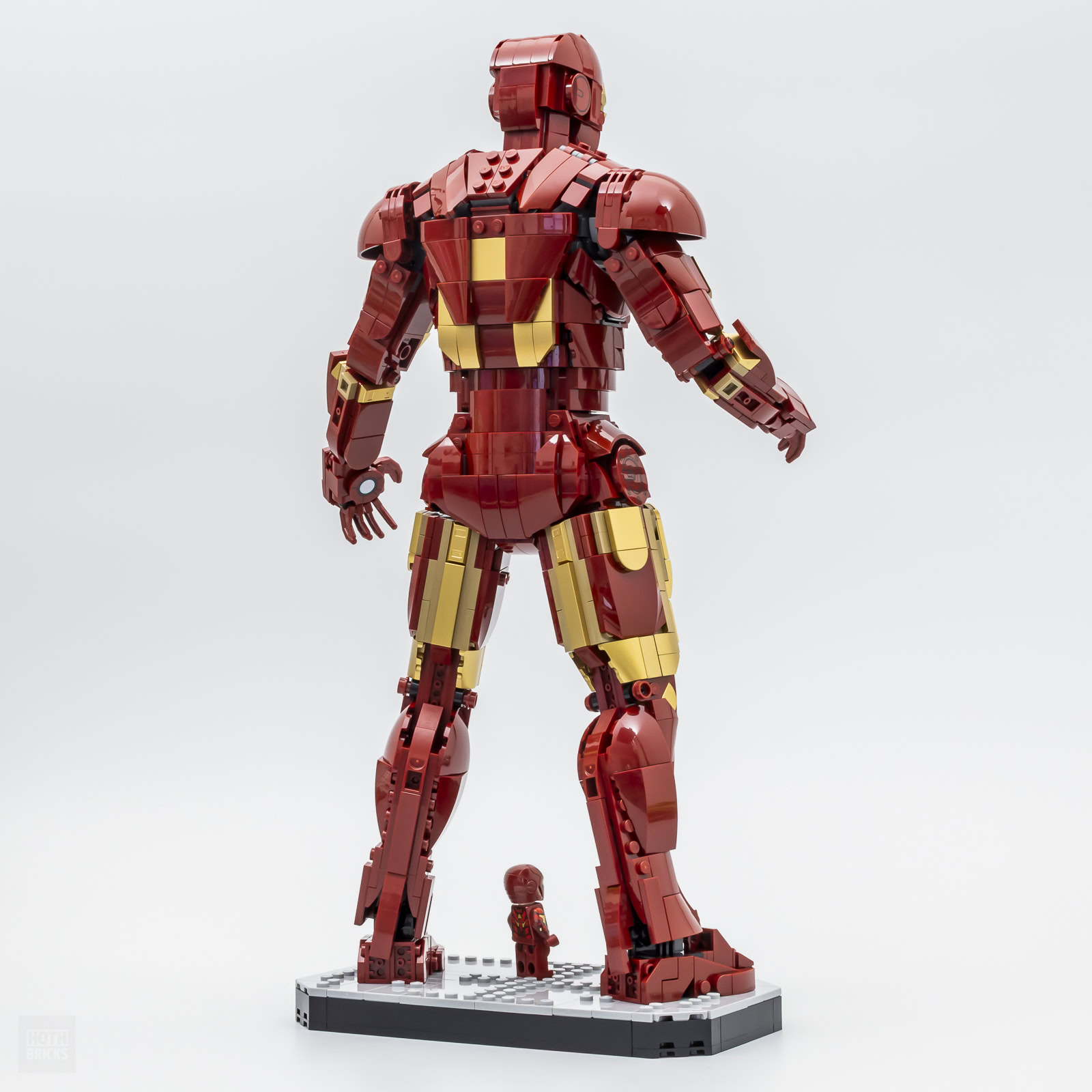 La figurine fournie pour accompagner la maquette de l'armure est inédite sous cette forme de la tête aux pieds, il n'y a que le casque qui existe dans cette version depuis 2022 et qui a été utilisé au fil des années pour les versions Mark III, IV, VI et VII de l'armure à l'échelle minifig. Inédite ne veut pas dire exclusive, rien ne dit à ce stade que cette figurine ne sera pas un jour livrée dans un autre produit de la gamme.