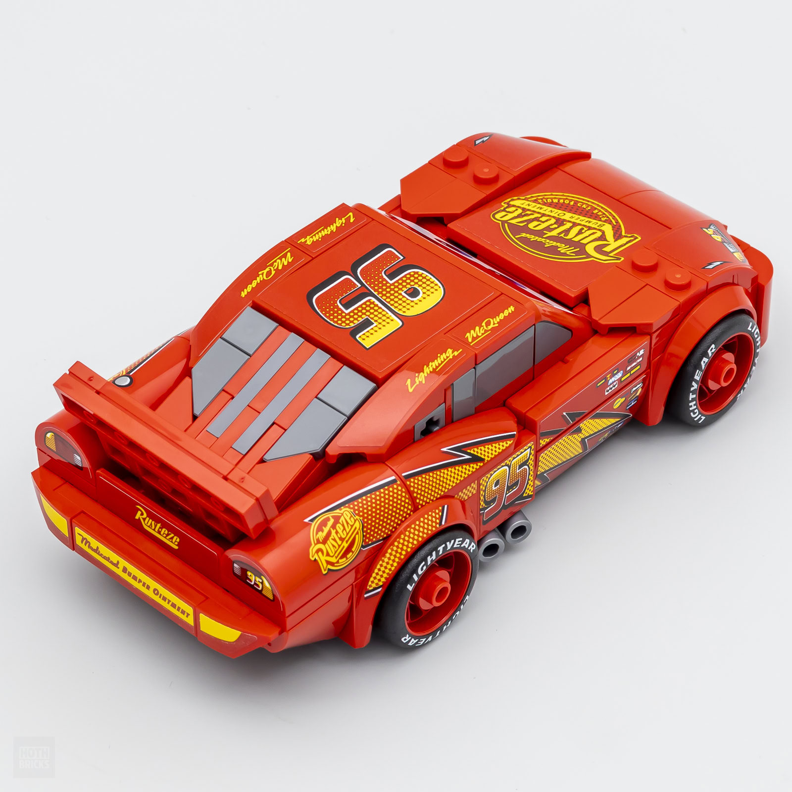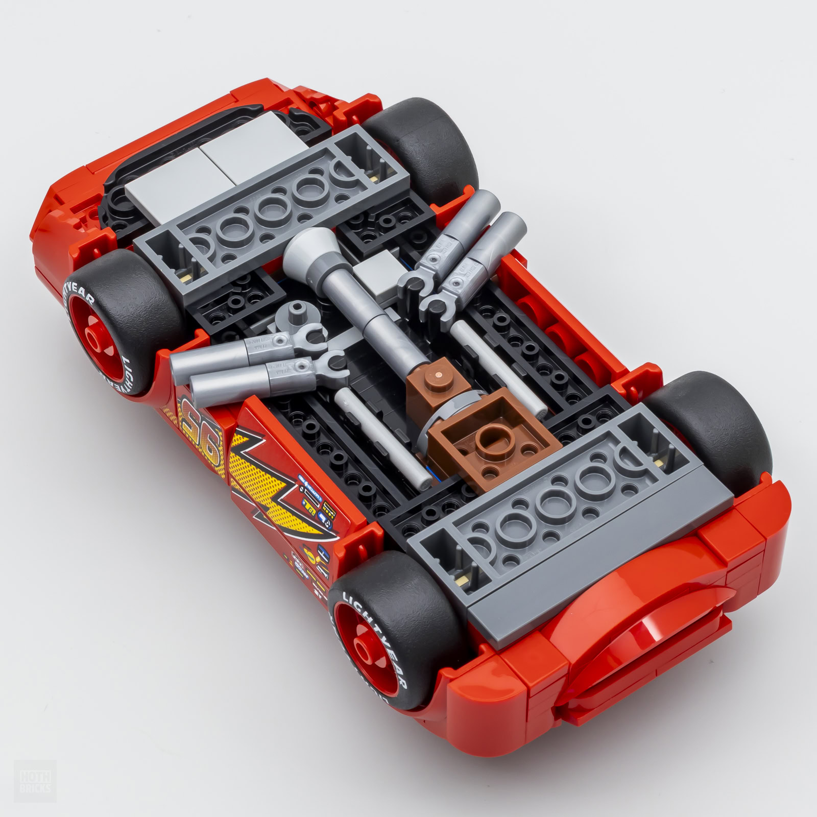 La carrosserie de Flash McQueen est quasiment exempte de tenons apparents sauf pour les deux paires visibles à l'avant sur les ailes. C'est assez pour confirmer qu'on est bien en présence d'un produit LEGO et suffisamment discret pour ne pas en faire trop.