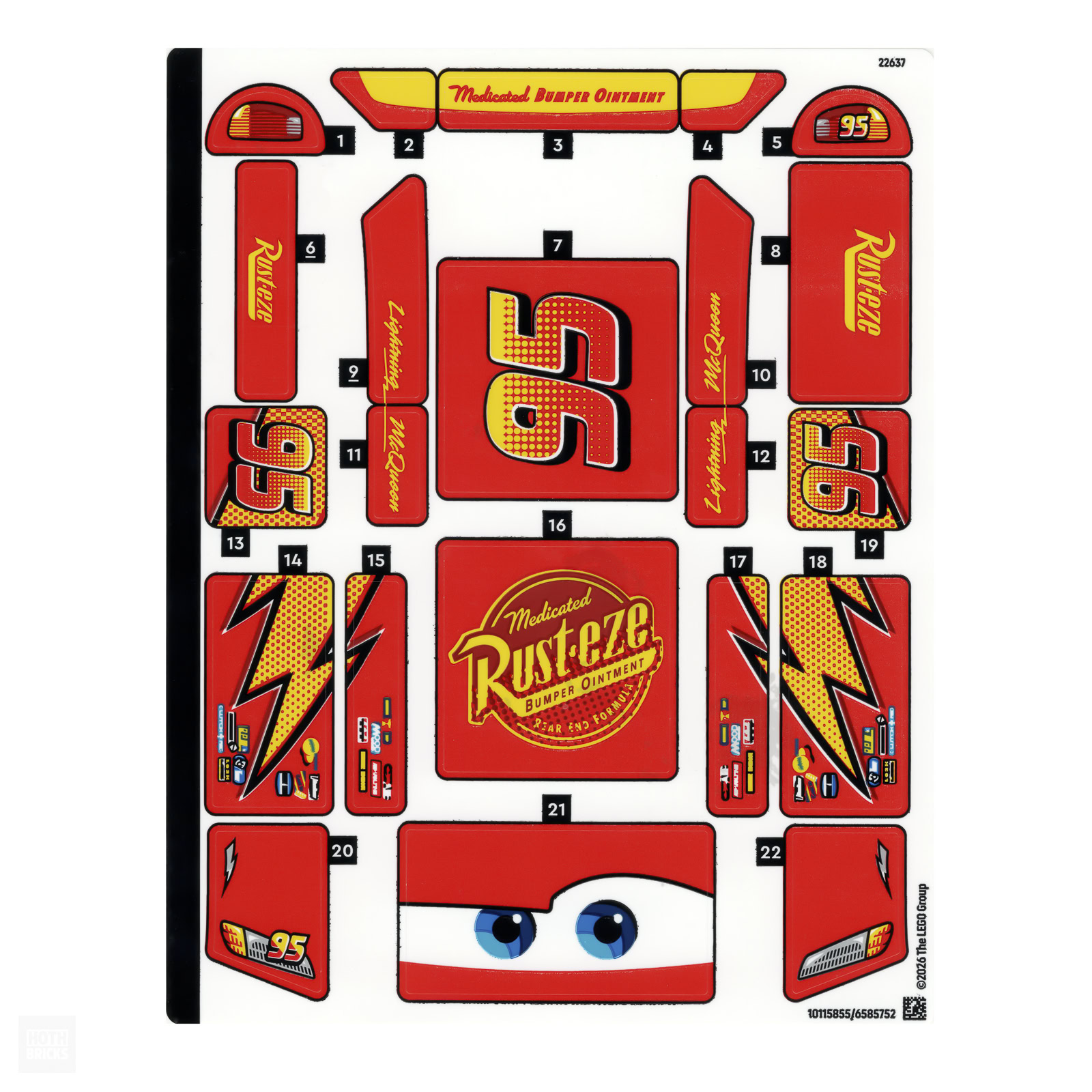 Vous vous en doutez parce que c'est le sujet traité qui l'impose, ce produit fait appel à une grosse fournée de stickers en tous genres qui viennent donner vie à Flash McQueen. Difficile de se passer de motifs sur un véhicule comme celui-ci, c'est à ce prix que le personnage prend vie. Certains éléments de la construction sont tampographiés, tous ceux que vous ne voyez pas sur la planche de stickers que je vous ai scanné, il s'agit surtout de ceux dont la surface courbe ne permettrait pas une pose facile des autocollants qui doivent y prendre place.