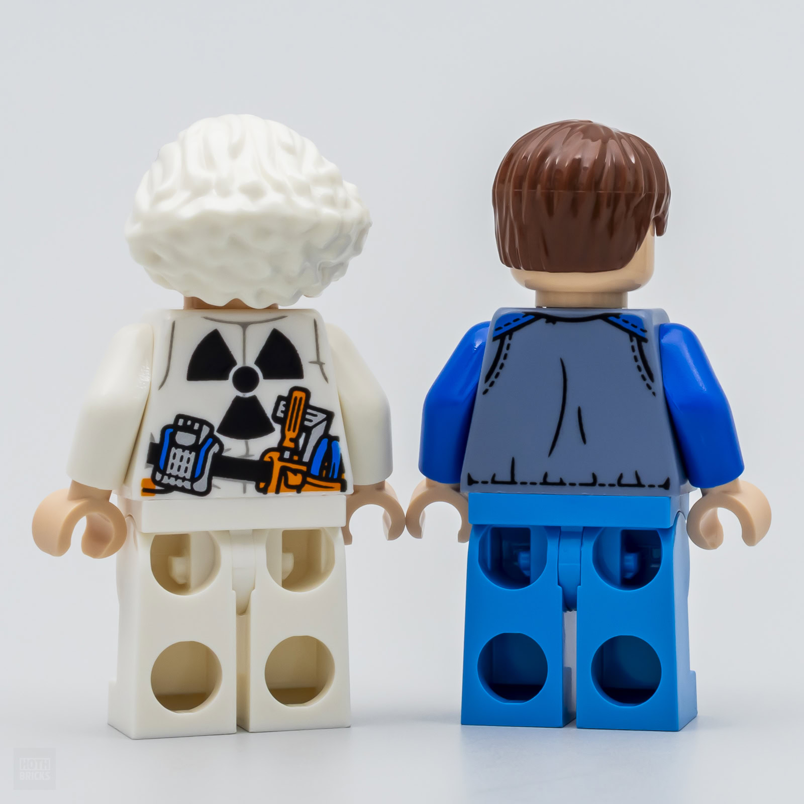 Deux minifigs sont livrées dans cette boite : Doc Brown et Marty McFly. la figurine de Marty McFly est totalement inédite sous cette forme avec son blouson sans manches qui prend ici la forme de l'accessoire déjà vu en 2024 sur les épaules de Cooper dans le set LEGO DREAMZzz 71484 Cooper's Robot Dinosaur C-Rex.