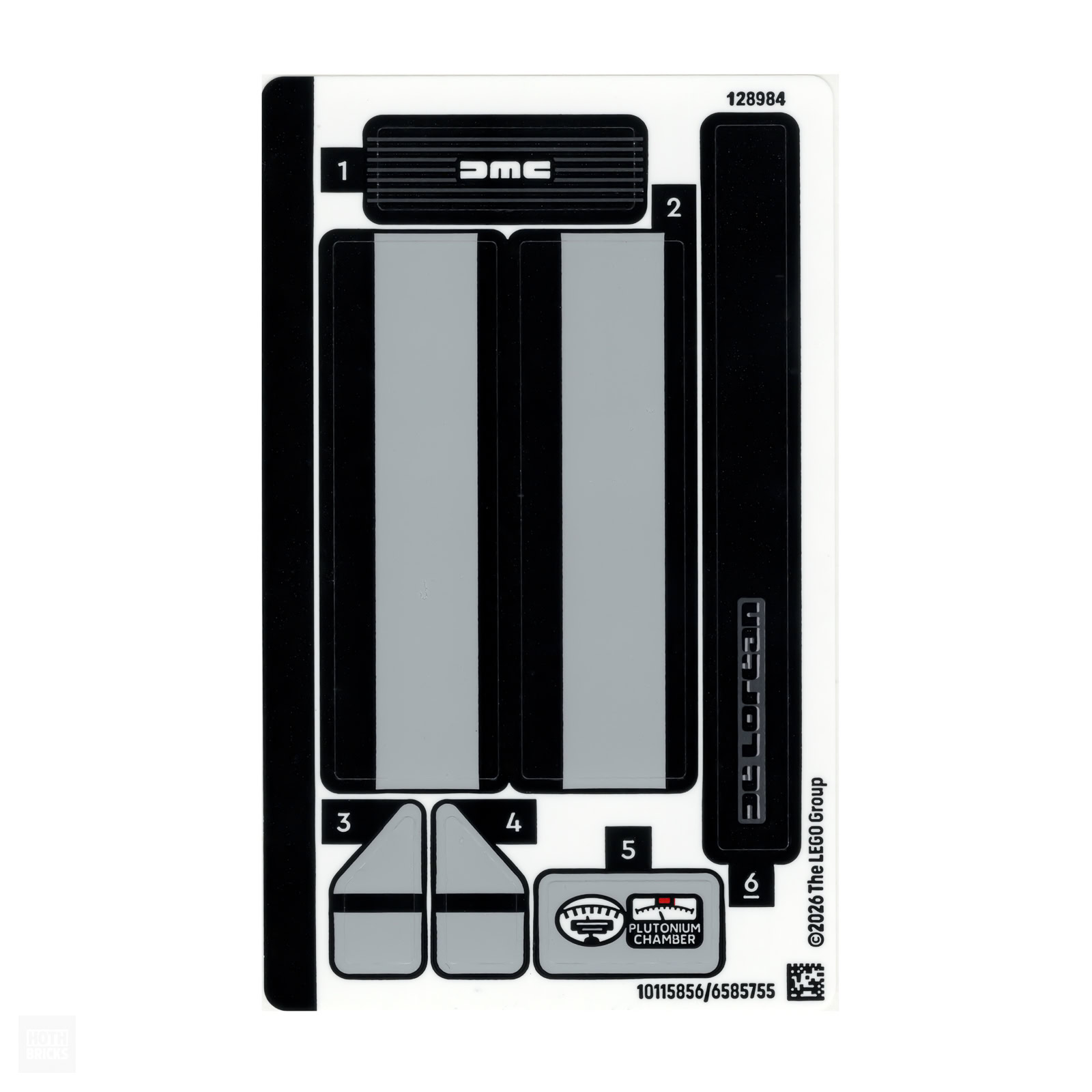 Autant la souligner tout de suite, cette DeLorean n'est pas bardée de stickers et elle fait usage d'une grosse poignée de pièces tampographiées. C'est une bonne nouvelle pour un set de la gamme LEGO Speed Champions, on sait que ces produits font généralement un usage intensif d'autocollants divers et variés. Il n' y a donc ici que 7 stickers et on regrettera juste que ceux sur fond gris ne soient pas totalement raccords avec la teinte de la carrosserie du véhicule.