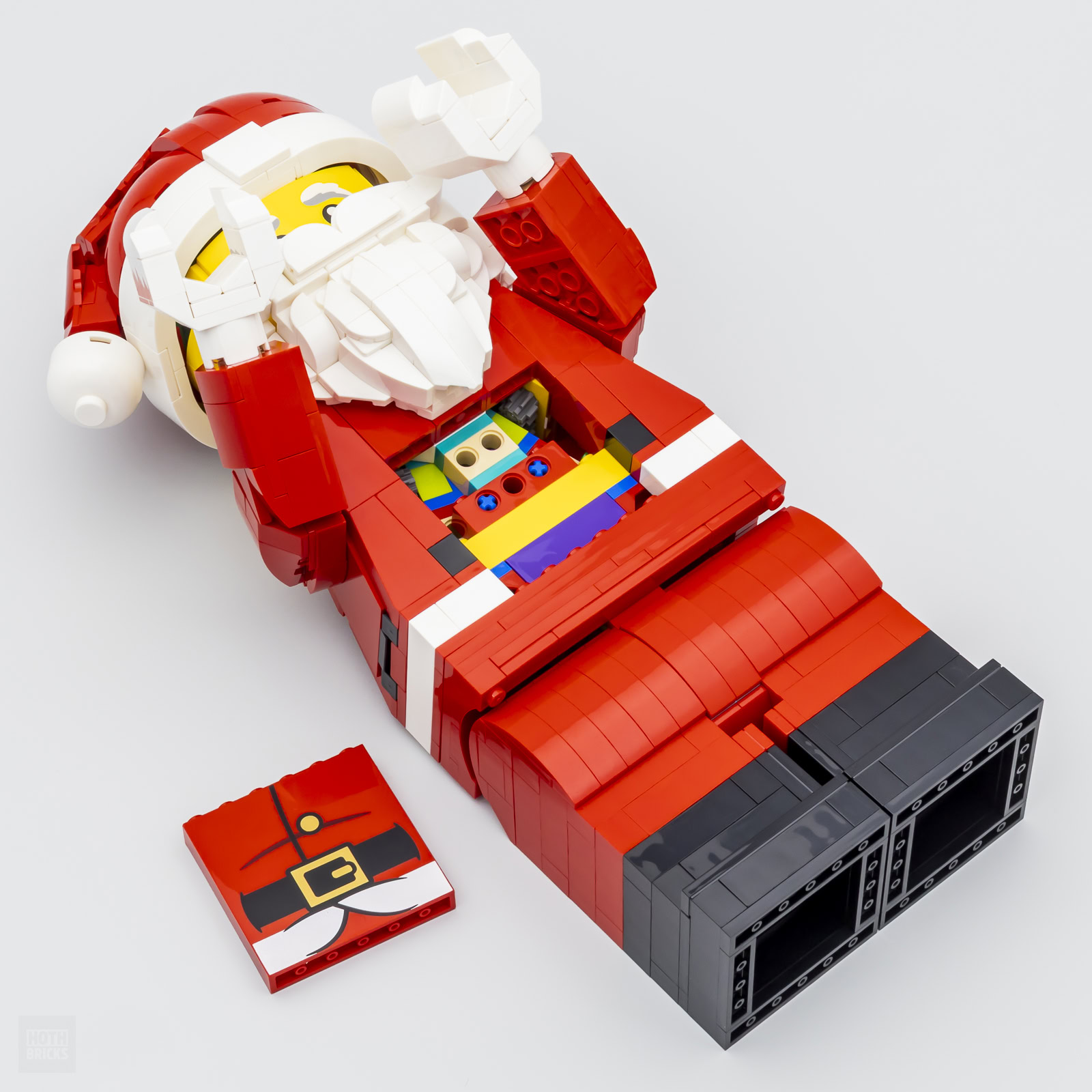 Ce Père Noël grand format a un potentiel décoratif évident malgré sa mobilité limitée. Il faudra cependant méticuleusement chercher le point d'équilibre de la construction pour lui faire prendre une pose moins statique que celles imaginées par LEGO qui se résument à présenter le personnage debout ou assis.