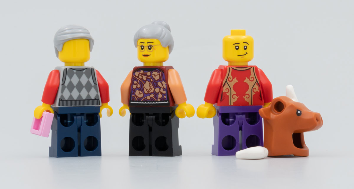 Du côté des minifigs, on obtient trois générations de "villageois" pour que la découverte de ce set et de la légende qu'il reproduit puisse être partagée avec les plus anciens qui sont ceux qui connaissent sans doute le mieux l'histoire du Nian.