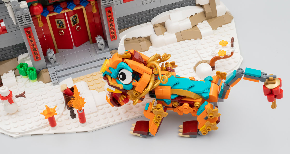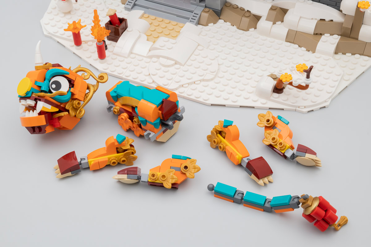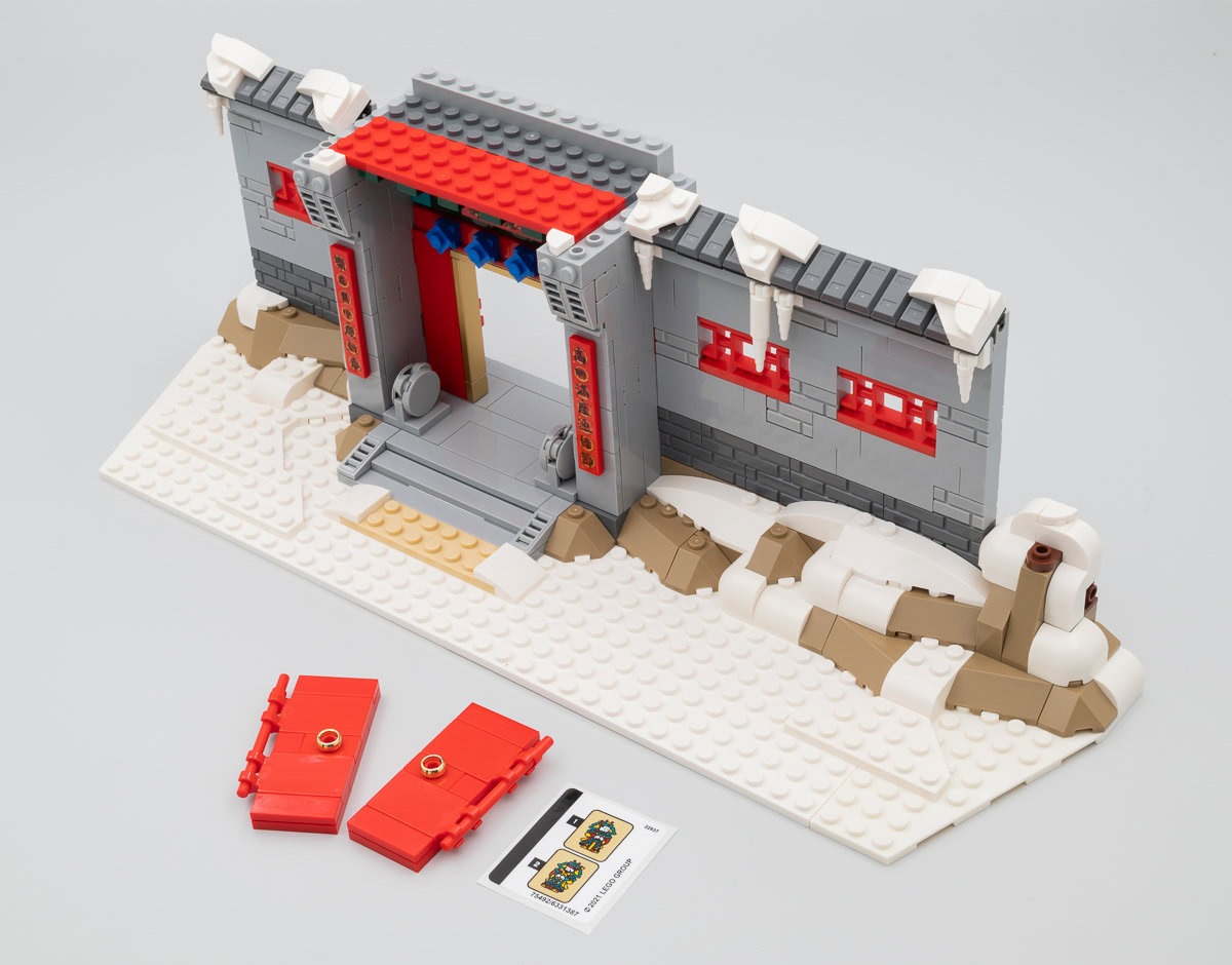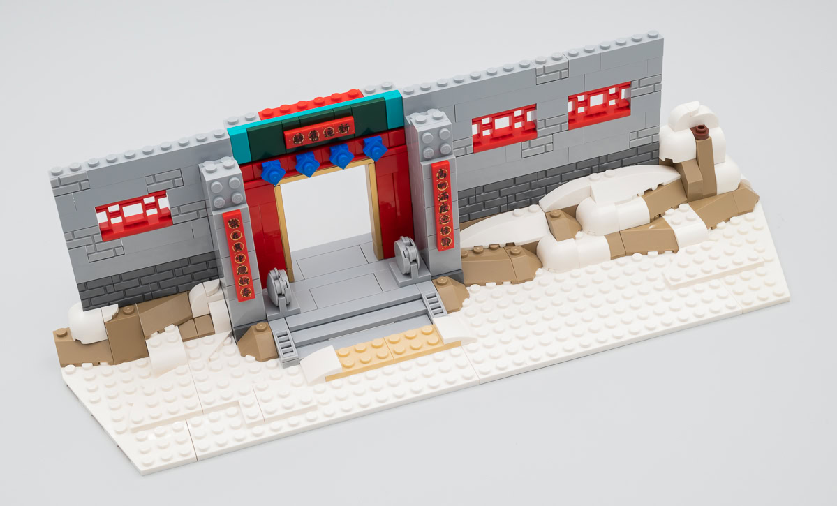 LEGO nous propose donc son interprétation des évènements avec une façade enneigée, une famille de villageois et le Nian. On comprend rapidement que la muraille avec ses portes ne sert que de décor pour mettre en scène l'affrontement entre les différents personnages et la méchante créature : il ne s'agit réellement que d'un simple façade avec un parvis sur lequel peuvent prendre place les figurines et le monstre. C'est sommaire, mais joliment réalisé et ce produit d'exposition affiche de belles dimensions : 36 cm de long, 17 cm de profondeur et 25 cm de haut, feux d'artifice compris.