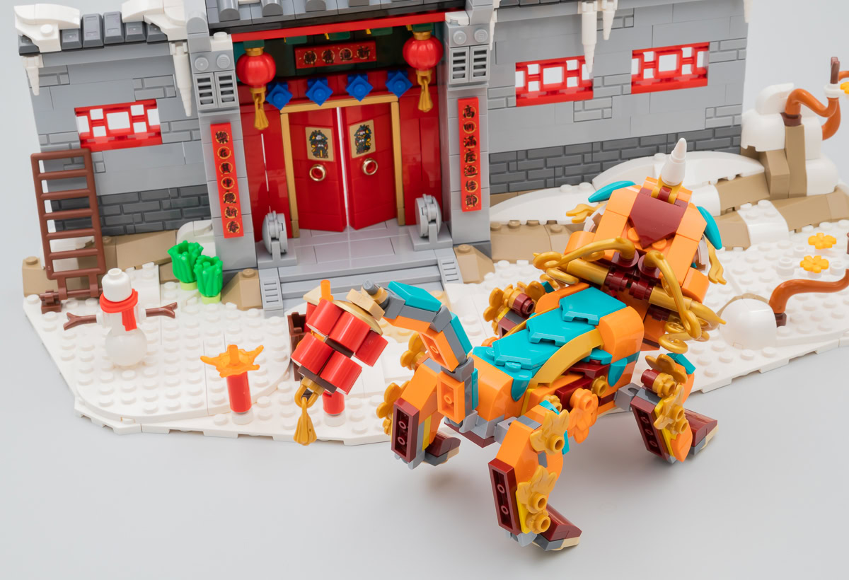 Pas de mystère, une grande partie de la phase d'assemblage consiste à empiler des briques pour obtenir le présentoir. Il ne reste guère que deux sachets sur les huit du set qui offrent un challenge un peu plus relevé avec la construction du Nian. La porte de la maison attaquée par le Nian est réussie mais le reste de la construction me laisse globalement sur ma faim malgré les quelques efforts sur la neige et sur les toits.