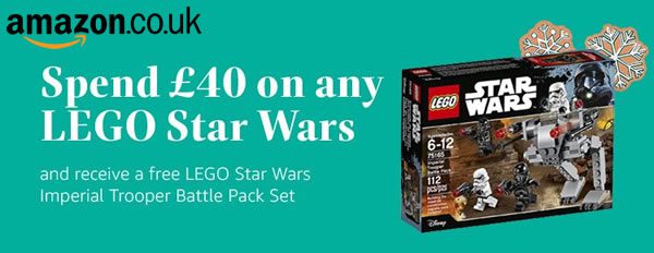 Dès £40 (45 €) d'achat en produits de la gamme LEGO Star Wars, amazon vous offre le set 75165 Imperial Trooper Battle Pack (prix public 14.99 €). Il vous faut ajouter le set dans votre panier et saisir ensuite le code FREELEGOSW pour que ce dernier ne vous soit pas facturé.