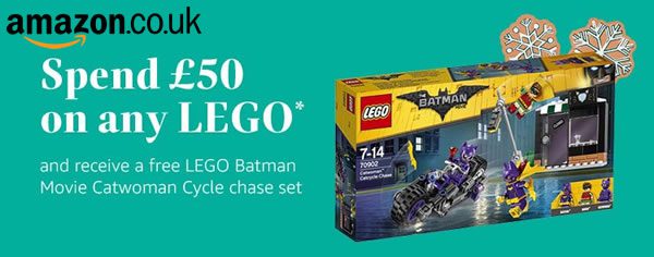 Dès £50 (56 €) d'achat en produits LEGO, amazon vous offre le set 70902 Catwoman Catcycle Chase (prix public 24.99 €). Il vous faut ajouter le set dans votre panier et saisir ensuite le code FREELEGOTOY pour que ce dernier ne vous soit pas facturé.
