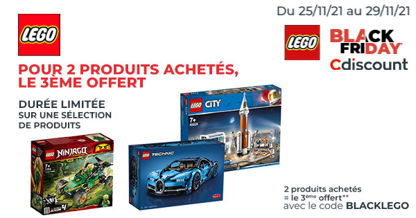 En ce Black Friday 2021, Cdiscount y va de son offre promotionnelle habituelle sur les produits LEGO qui permettra peut-être à certains d'économiser quelques euros : Si vous commandez trois produits LEGO éligibles à l'offre parmi la sélection de sets LEGO Technic, Ninjago, CITY, Friends, Classic ou encore DUPLO proposée et que vous saisissez le code BLACKLEGO dans le panier avant de valider la commande, le produit le moins cher est offert.
