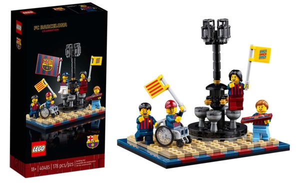 Ce petit set de 178 pièces sous licence officielle du FC Barcelone est valorisé à 29.99 $ sur la version australienne de la boutique en ligne LEGO. Dans la boite, de quoi assembler une reproduction de la fontaine de Canaletes autour de laquelle se rassemblent les supporters pour célébrer les victoires de leur club et cinq minifigs toutes habillées du même torse aux couleurs de l'équipe.