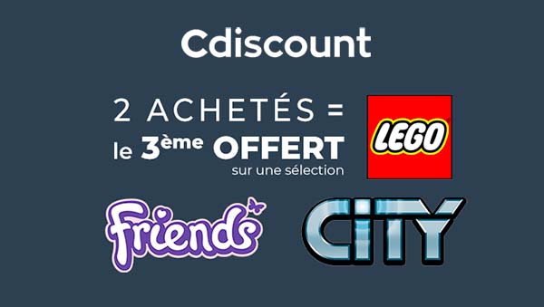 Cdiscount y va de son offre promotionnelle habituelle sur les produits LEGO qui permettra peut-être à certains d'économiser quelques euros : Si vous commandez trois produits LEGO éligibles à l'offre parmi la sélection de sets LEGO CITY et Friends proposée et que vous saisissez le code LEGOBTS21 dans le panier avant de valider la commande, le produit le moins cher est offert.
