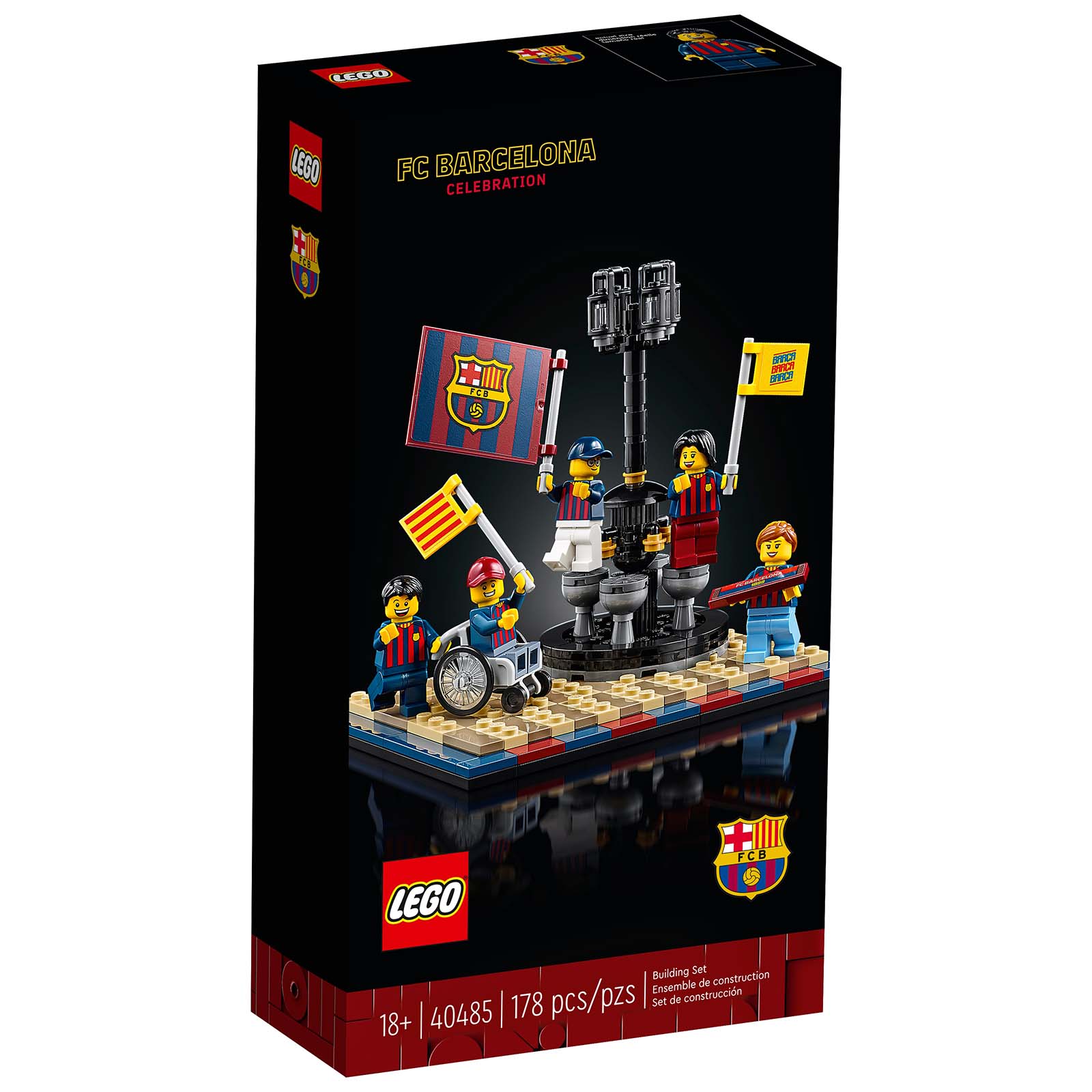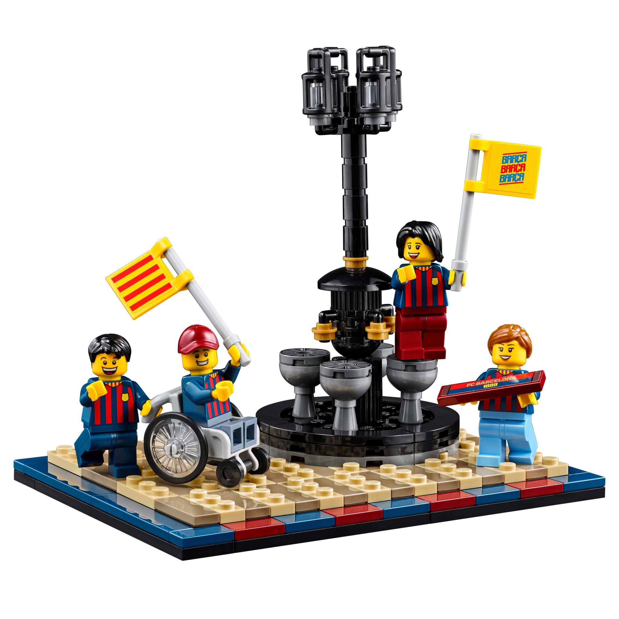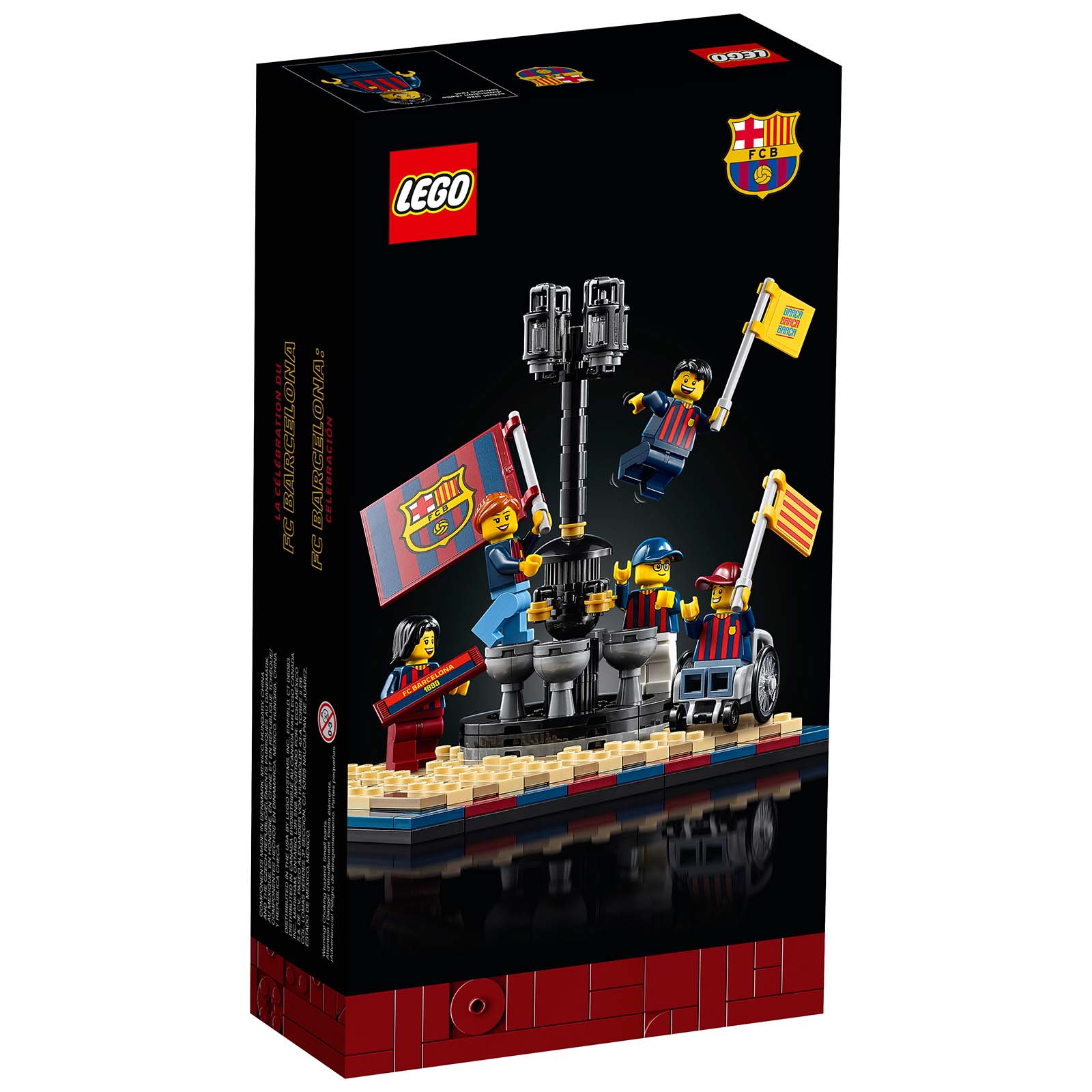 Ce petit set de 178 pièces sous licence officielle du FC Barcelone est valorisé à 29.99 $ sur la version australienne de la boutique en ligne LEGO. Dans la boite, de quoi assembler une reproduction de la fontaine de Canaletes autour de laquelle se rassemblent les supporters pour célébrer les victoires de leur club et cinq minifigs toutes habillées du même torse aux couleurs de l'équipe.