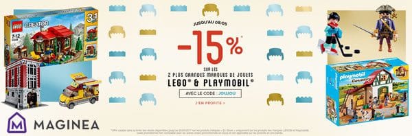 Bonus : Maginéa propose 15% de réduction sur les produits LEGO (et PLAYMOBIL)jusqu'au 8 mai prochain avec le code JOUJOU :