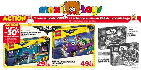 Toys R Us emboîte le pas à Maxi Toys avec une offre similaire : 50% de réduction sur le second produit LEGO acheté (le moins cher des deux). Si vous achetez deux articles identiques, vous obtenez donc une réduction de 25% par boite.