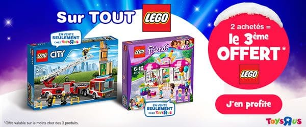 C'est le retour de l'offre "2 produits LEGO achetés, le 3ème offert" chez Toys R Us. Cette offre qui vous permet de ne pas payer le moins cher des trois produits commandés est valable uniquement les 19 et 20 décembre 2016.
