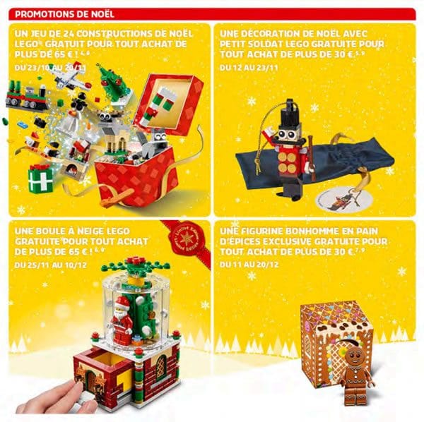 | Du 23 octobre au 20 novembre 2016 : 40222 Christmas Build Up offert dès 65€ d’achat. Du 12 au 23 novembre 2016 : 5004420 Toy Soldier offert dès 30€ d’achat. Du 25 novembre au 10 décembre 2016 : 40223 Snowglobe offert dès 65€ d’achat. Du 11 au 20 décembre 2016 : 5005156 Gingerbread Man offert dès 30€ d’achat. Du 11 au 31 décembre 2016 : Le polybag 5004408 Rebel A-Wing Pilot offert dès 30 € d'achat de produits de la gamme LEGO Star Wars. |