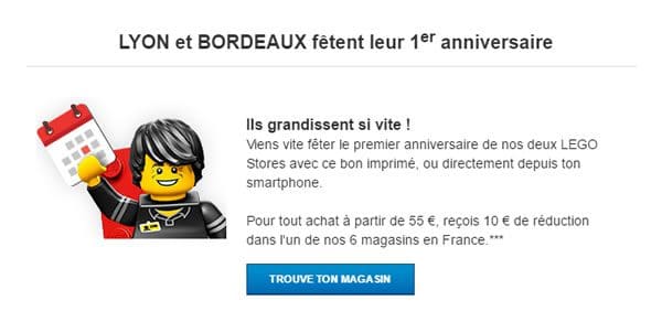 Jusqu'au 9 novembre, vous pouvez obtenir 10 € de réduction à partir de 55 € d'achat dans un LEGO Store sur simple présentation de l'email en question, imprimé ou sur l'écran de votre smartphone.