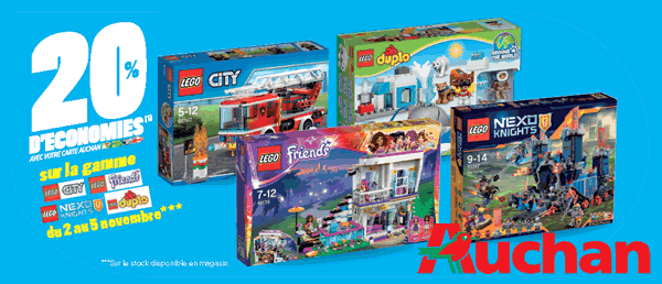 Avis aux porteurs de la carte Waaoh !!! : jusqu'au 5 novembre 2016 Auchan propose 20% de réduction sur certaines gammes LEGO sous la forme d'un crédit sur la carte de fidélité de l'enseigne.