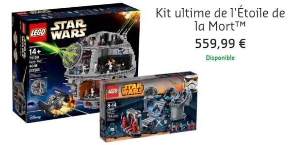 Tous ceux qui attendaient pour s'offrir le set 75159 UCS Death Star (499.99 €) ou le Death Star Ultimate Kit (5005217) comprenant les sets 75159 Death Star et 75093 Death Star Final Duel (559.99 €) auront là une occasion intéressante de pouvoir les obtenir à un tarif intéressant.