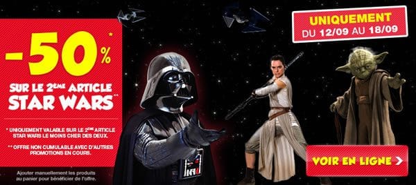 Petit rappel pour ceux qui ne suivent pas les commentaires de la page Bons Plans : Vous avez jusqu'au 18 septembre prochain pour profiter d'une remise de 50% sur le second article Star Wars acheté (Le moins cher des deux, évidemment) chez Maxi Toys.