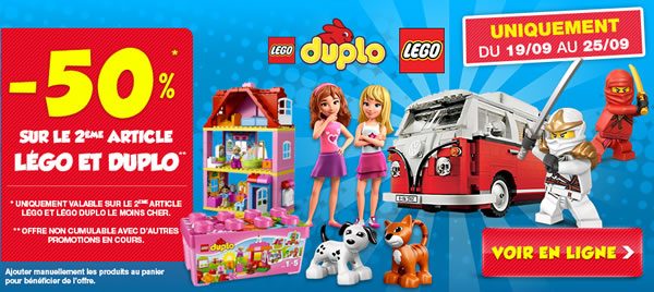 Après une opération du même type valable uniquement sur la gamme de produits sous licence Star Wars, Maxi Toys remet le couvert avec 50% de remise sur le 2ème produit LEGO ou DUPLO acheté jusqu'au 25 septembre prochain.
