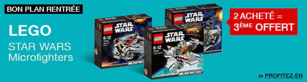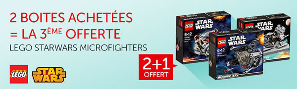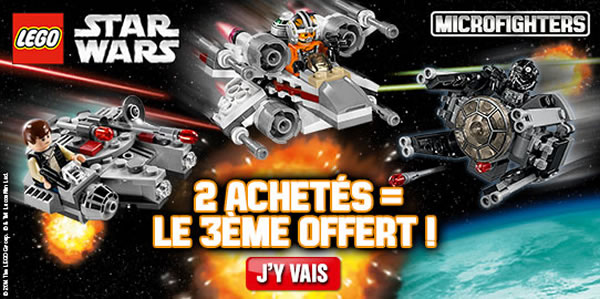 C'est au tour de Toys R Us de proposer la promotion qui a déjà eu lieu chez Cultura et FNAC.com : Vous achetez deux sets de la gamme LEGO Star Wars Microfighters parmi les six références disponibles et vous obtenez le troisième gratuitement.