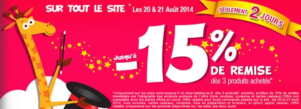Toys R Us propose aujourd'hui et demain jusqu'à 15% de remise immédiate dès 3 produits achetés.