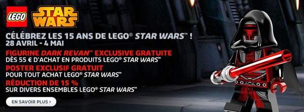 Quelques sets et quelques produits dérivés Star Wars sont actuellement proposé avec une réduction de 15% sur leur prix public (Voir la liste complète). Rien de très excitant, on trouve souvent moins cher ailleurs, mais certains y trouveront peut-être quelque chose qui leur permettra de bénéficier des deux offres ci-dessus, poster et minifig exclusive, qui sont cumulables.