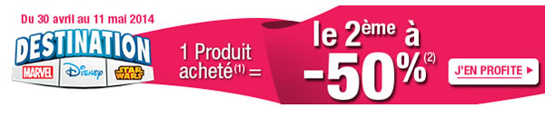 Une offre intéressante valable du 30 avril au 11 mai 2014 sur les produits Marvel, Disney et Star Wars chez Toys R Us avec une remise de 50% sur le deuxième produit acheté.