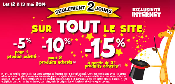 Ce n'est pas l'offre du siècle, mais comme vous avez été nombreux à me la signaler, je la publie ici : Toys R Us propose aujourd'hui 12 mai et demain 13 mai une réduction qui augmente avec le nombre d'articles dans votre commande avec un maximum de 15% de remise immédiate à partir de 3 produits achetés. L'offre est valable uniquement sur Internet, elle n'est pas applicable en magasin (Voir les conditions d'application de l'offre sur le site).