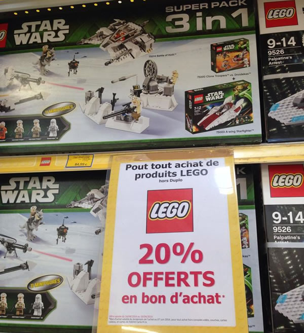 "...Offre valable du 9 avril au 4 mai 2014 inclus, pour l'achat d'un produit LEGO parmi une sélection. Vous recevrez un email contenant un bon d'achat Internet d'un valeur équivalente à 20% du prix indiqué. Le bon sera utilisable lors d'une commande ultérieure passée sur internet exclusivement, valable du lendemain de l'achat au 7 juin 2014 inclus..."