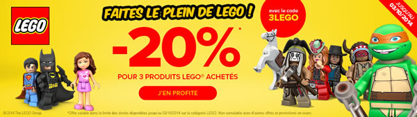 De son côté, Toys R Us offre 20% en bon d'achat internet sur toute la gamme City du 16 mars au 3 avril 2016. Offre limitée à l'achat d'un exemplaire de l'article porteur de l'offre pour un même panier de commande. Le code permettant de profiter de la réduction sera valable du 4 au 26 avril 2016 inclus et utilisable uniquement pour l'achat d'un produit LEGO.