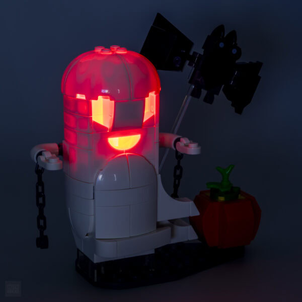 On retiendra l'utilisation ici de trois exemplaires de la brique 2x4 en Transparent Opal déjà vue dans plusieurs autres sets depuis 2023 et mise à profit ici pour l'intérieur de la tête du fantôme, ces trois briques laissent passer la lumière rouge émise par la brique lumineuse fournie.