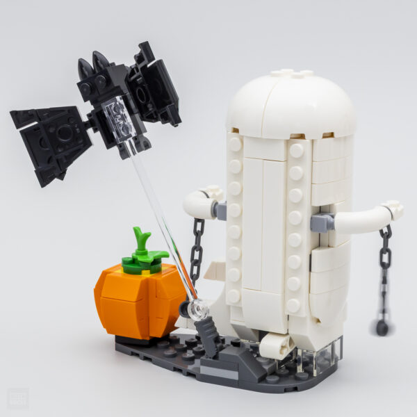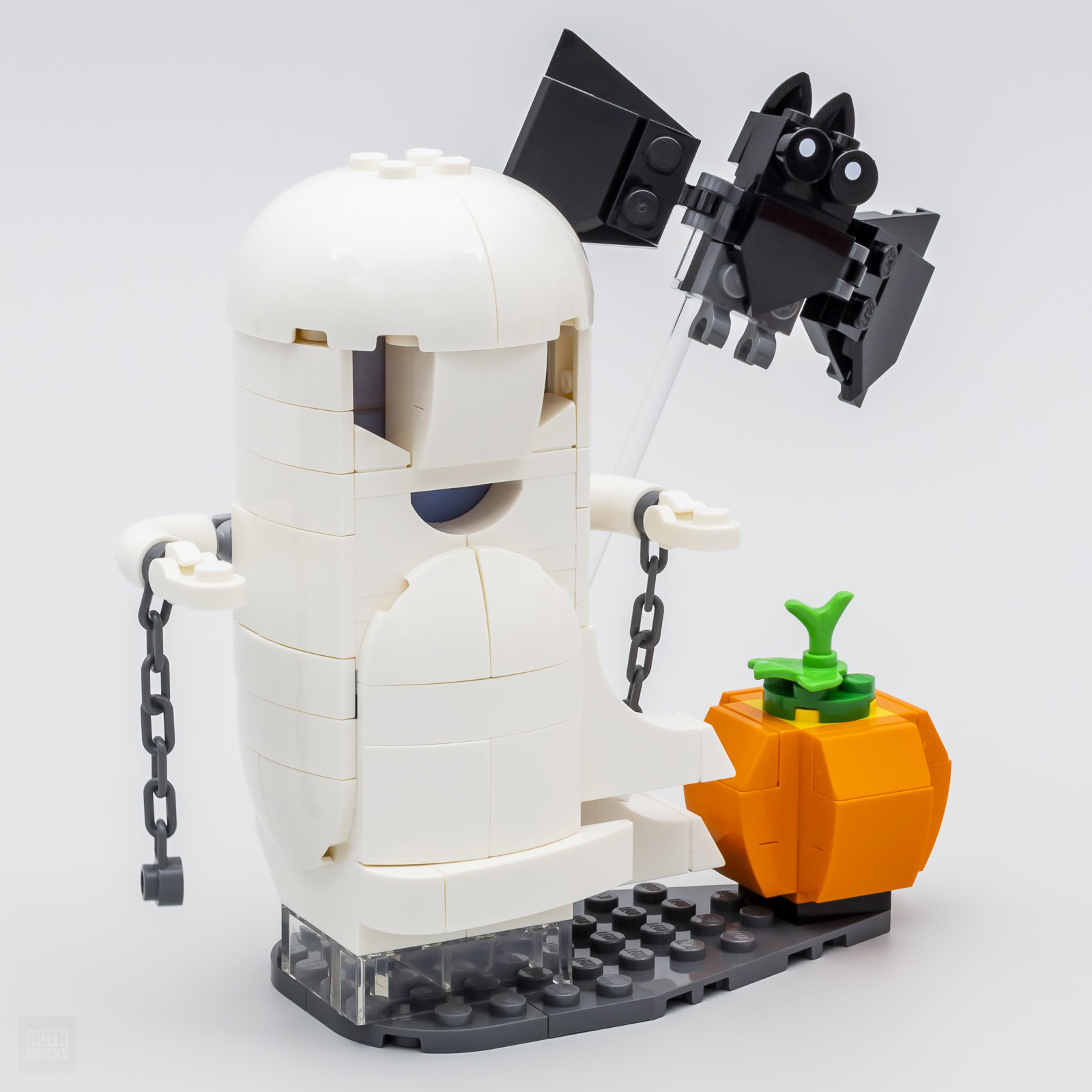 Le fantôme est comme en lévitation grâce à l'utilisation de quelques briques transparentes, il est accompagné d'une citrouille et d'une chauve-souris installée sur une tige transparente. Pas de quoi se lever la nuit si vous n'avez rien de précis à acheter au prix fort sur la boutique officielle en ligne en ce moment.