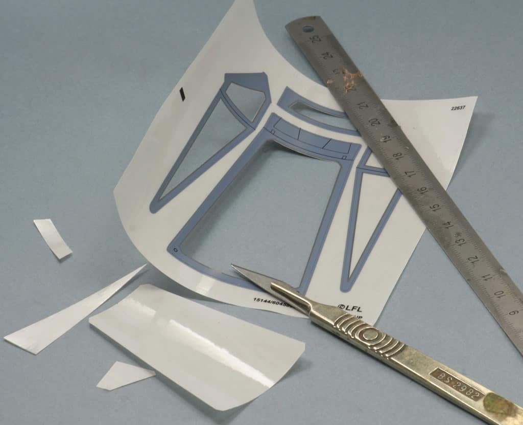 Etape 1 : Découpage soigné de l'intérieur des autocollants à l'aide d'une lame neuve et d'un réglet.