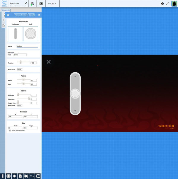 En quelques clics, vous pouvez ajouter les différents boutons et curseurs qu'il faudra plus tard associer aux différents ports de la SBrick. Rien de très compliqué, il n'est pas nécessaire d'être ingénieur ou astronaute pour paramétrer la télécommande virtuelle. Vous pouvez ensuite choisir de garder votre précieux profil pour vous-même ou vous pouvez décider de le partager avec le reste de la communauté SBrick.