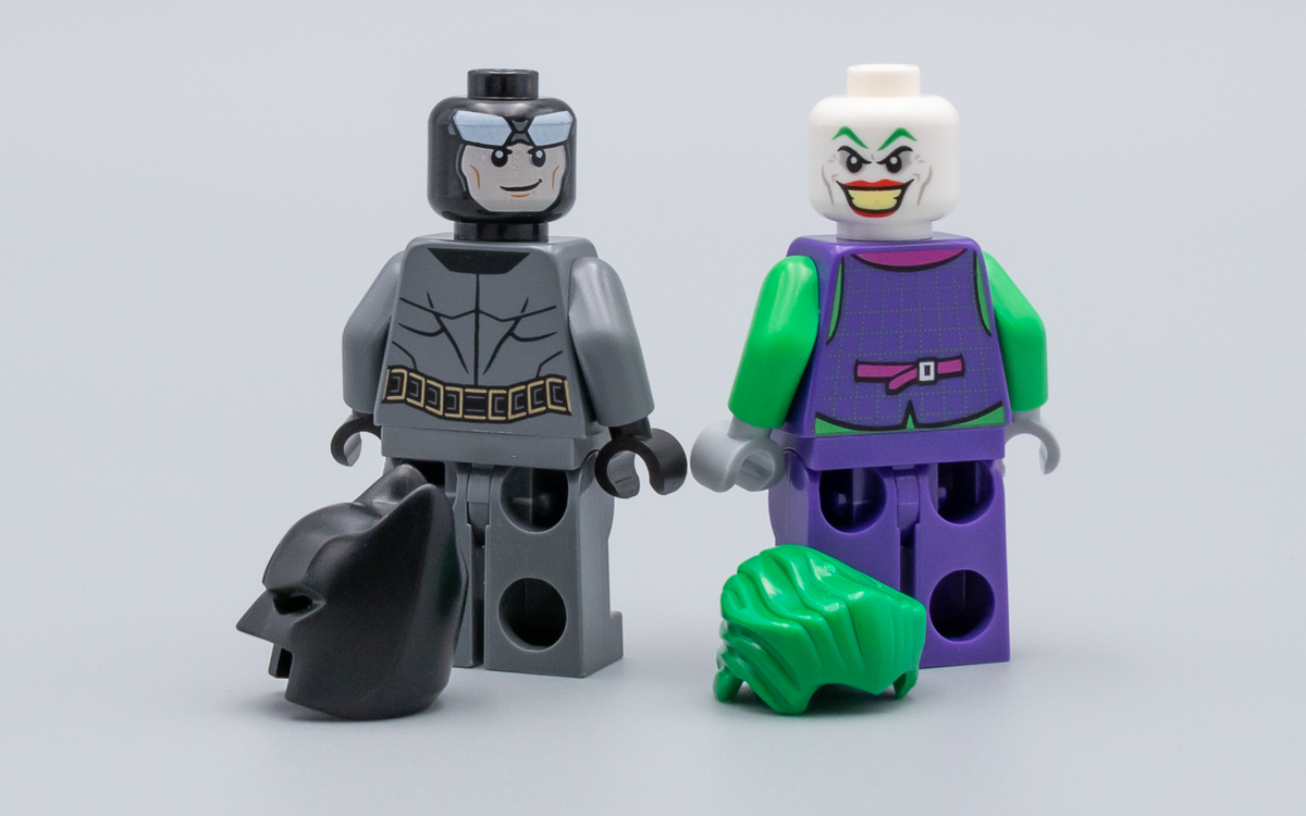 LEGO a eu la bonne idée d'utiliser un torse violet  et d'y tampographier les éléments verts qui sont à peu près de la même teinte que les bras du personnage. Le veston est donc parfaitement assorti aux jambes et la minifig est visuellement très réussie. La tête n'est pas inédite, c'est celle du personnage livré dans le set Juniors 10753 The Joker Batcave Attack (2018).