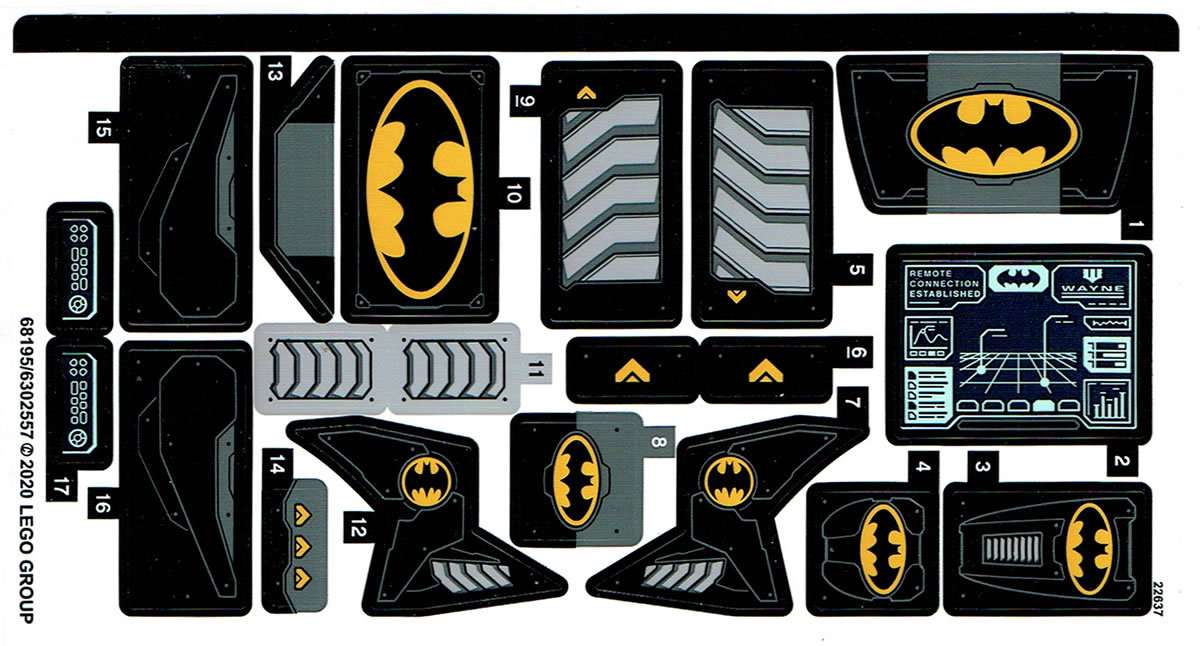 L'inévitable planche de stickers est ici assez fournie avec notamment une flopée de bat-logos à coller un peu partout pour que le propriétaire des différents véhicules soit bien identifiable. Noir sur noir, ça fonctionne, il n'y a pas de risque d'écart de teinte.