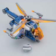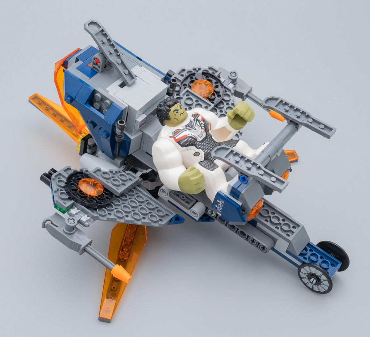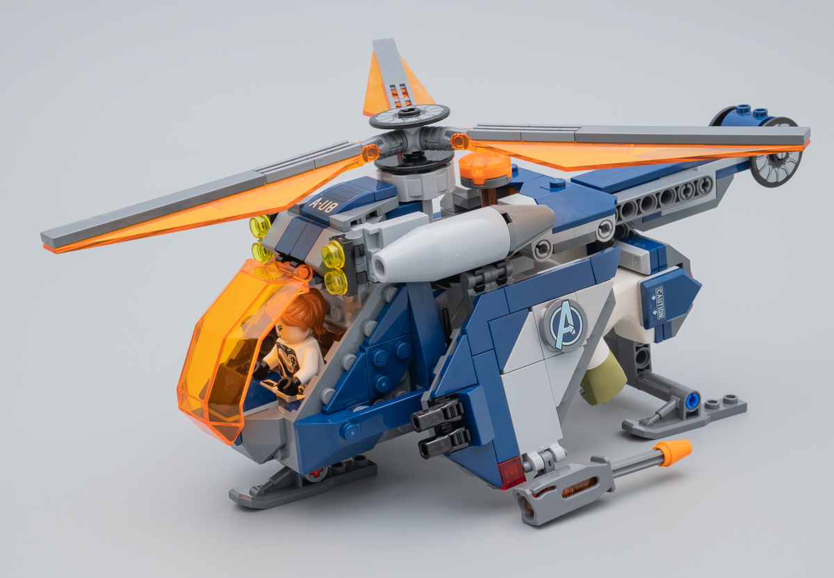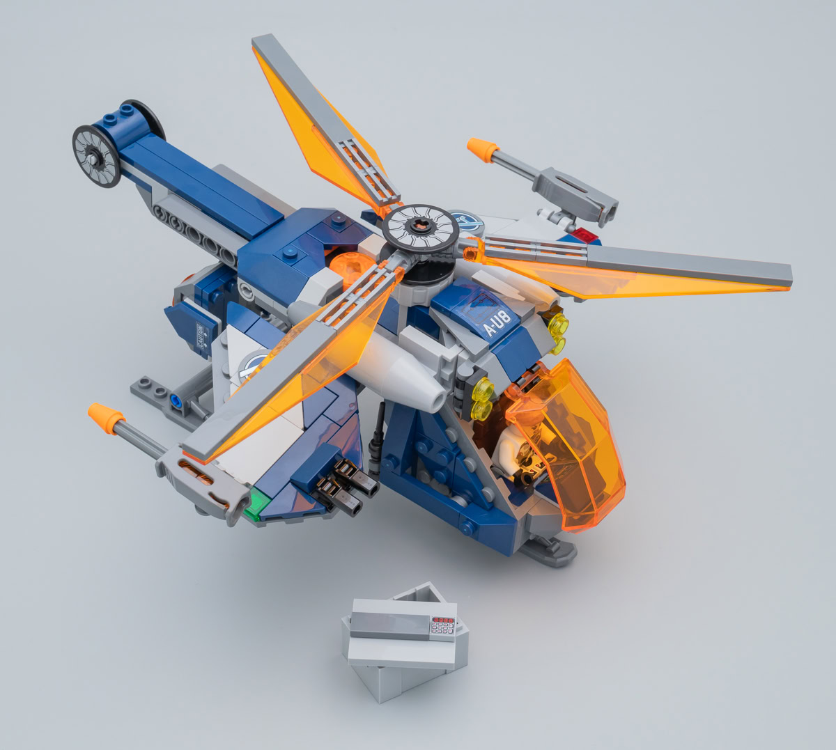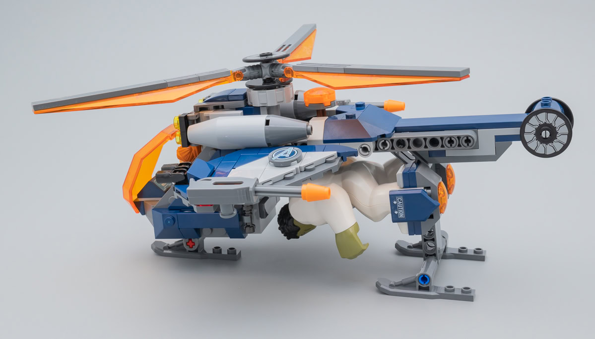 Comme il fallait absolument proposer un véhicule, le designer s'est dit qu'un hélicoptère ferait l'affaire. Et si en plus il permet de larguer Hulk sur les méchants Chitauris, c'est encore mieux. Ni l'engin, ni la fonctionnalité ne sont évidemment présents dans le film. L'hélicoptère pourrait presque faire illusion s'il n'était pas aussi farfelu avec ses pales et sa verrière qui semblent sortis tout droit d'un set de la gamme LEGO Nexo Knights, ses patins et ses lance-missiles négligemment placés au bout des ailes.