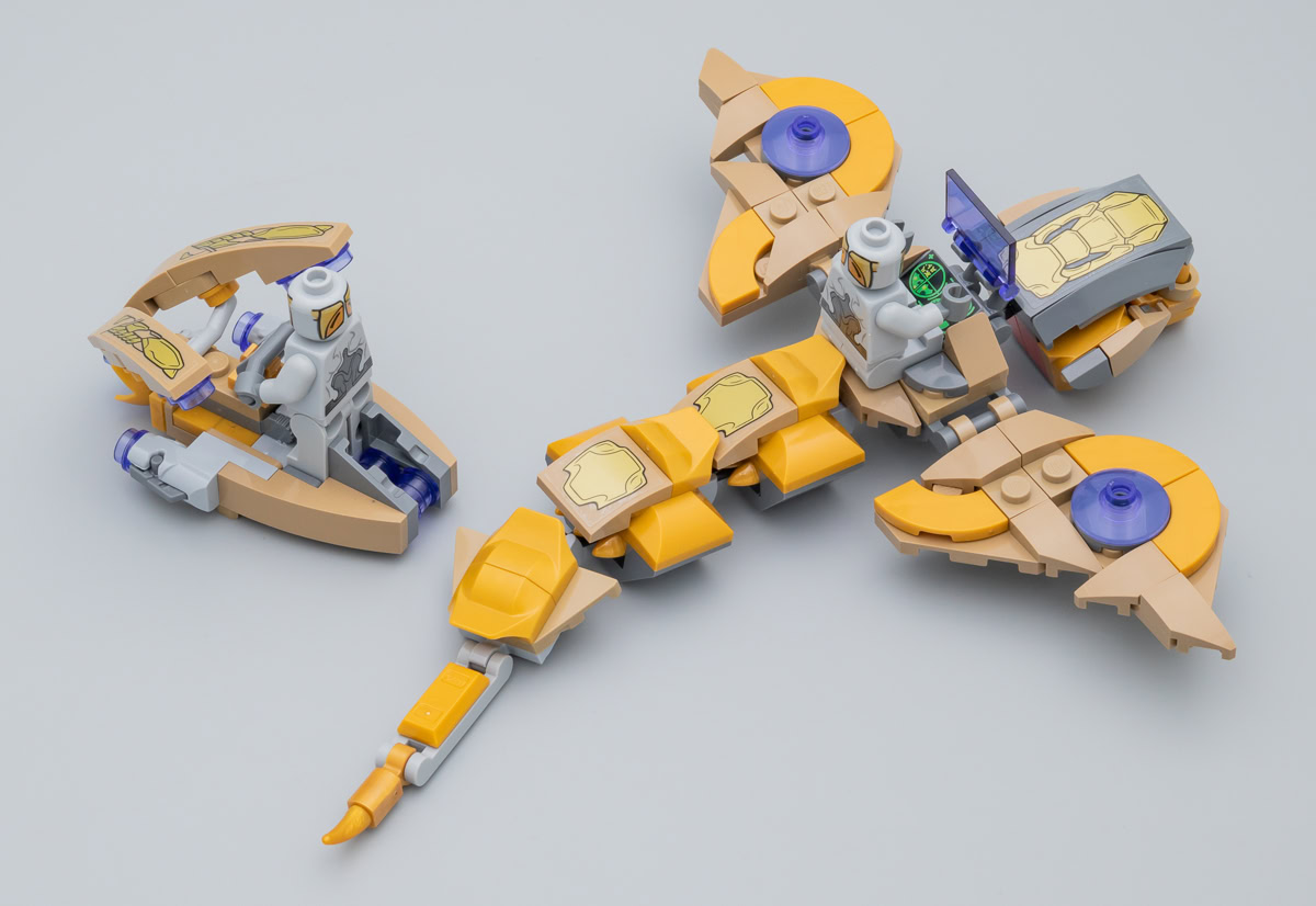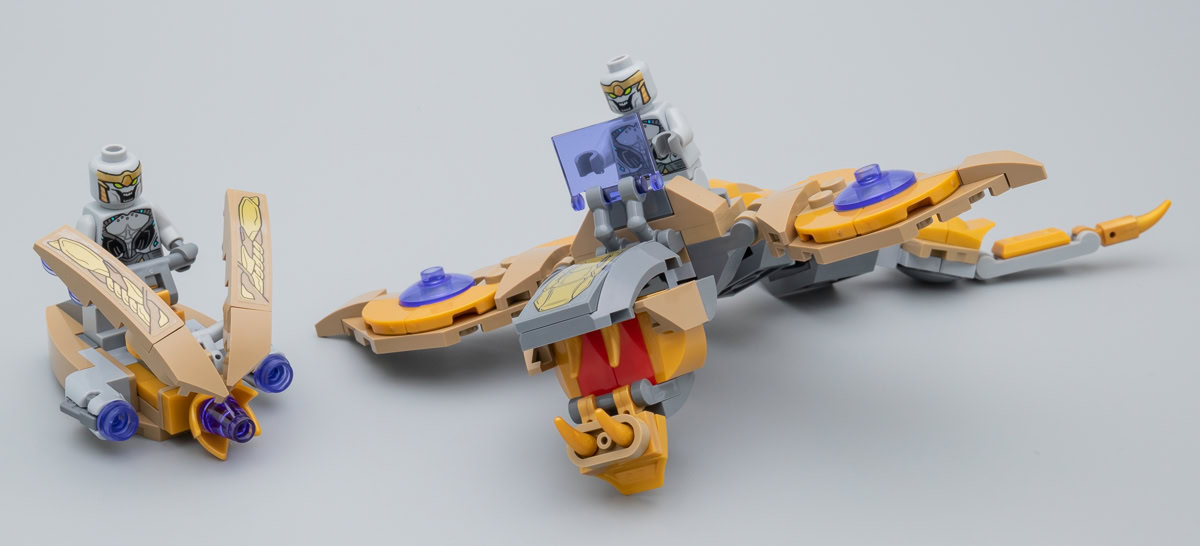 Du côté des méchants, le Leviathan à construire est bien loin de rendre hommage à la version du film. Ici, on se contente d'un mini-modèle articulé à la façon d'un serpent ou d'un dragon Ninjago avec un poste de pilotage extérieur. On frôle le Microfighter et c'est un peu dommage pour un set vendu 60 €. La couverture de livre en Trans Purple qui sert ici de HUD n'est pas inédite, elle était déjà livrée dans deux sets The LEGO Movie 2 commercialisés en 2019. L'autre engin fourni permet d'y installer un Chitauri et c'est sans doute l'élément du set le plus fidèle au film.