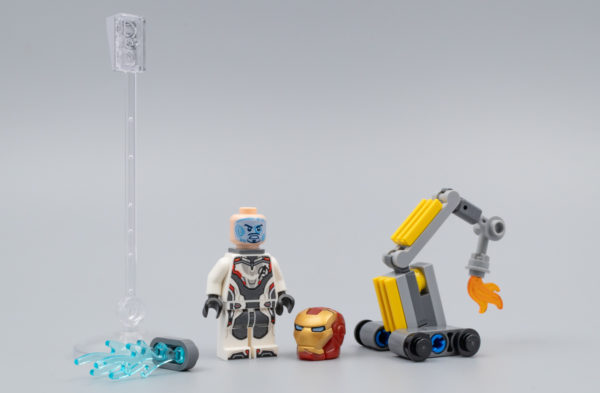 Pas de surprise à l'intérieur, ce qui s'y trouve est présenté sur le sachet : Une minifig d'Iron Man en version Quantum Suit qui rejoindra l'ensemble des autres personnages dans la même tenue répartis dans les différents sets basés sur le film, un support transparent pour que la minifig prenne un peu de hauteur et Dum-E, l'assistant-robot de Tony Stark.