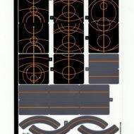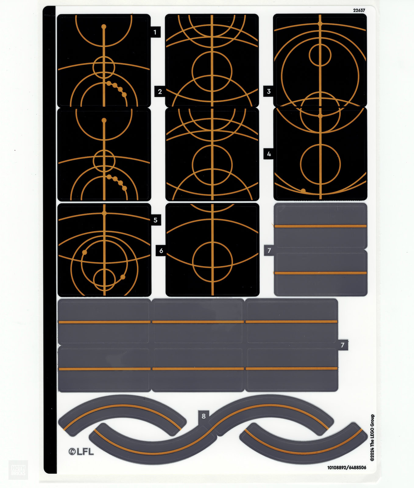 Ce set est une fois de plus flanqué d'une grosse planche de stickers, avec des autocollants sur fond noir au demeurant graphiquement très bien exécutés, sans laquelle la construction manquerait largement de contexte et de cachet. Une fois de plus, la couleur de fond de certains de ces autocollants, ceux sur fond gris, n'est pas totalement raccord avec la teinte des pièces sur lesquelles on les installe et c'est moche.