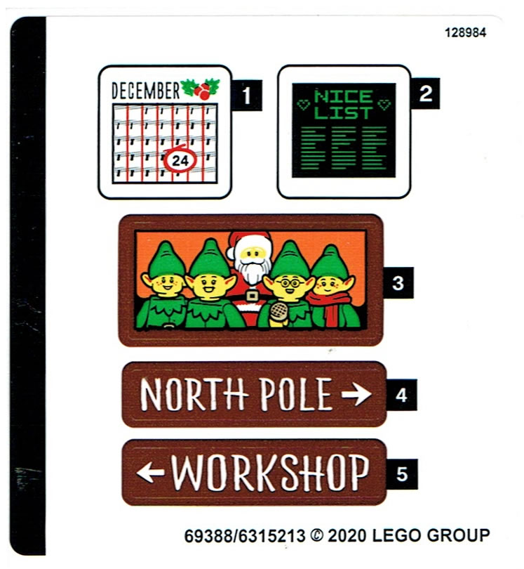 Il n'y a que cinq stickers à coller dans cette boite dont un portrait des quatre elfes avec leur employeur, deux panneaux de direction dont un qui renvoie vers l'atelier, un calendrier et l'écran de l'ordinateur. C'est plus que les trois autocollants de la Gingerbread House mais ça reste raisonnable. Je note quelques différences de teinte sur les briques en Sand Green qui constituent les murs du premier étage. Le problème n'est donc toujours pas résolu, il faudra faire avec.