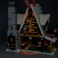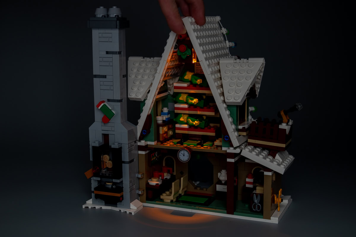 La brique lumineuse fournie à installer sous le toit ne fait pas de miracle. Elle éclaire mollement la chambre des elfes, et uniquement si vous maintenez le doigt sur le bouton déporté. On ne le répètera jamais assez, il serait temps que LEGO propose une brique lumineuse avec un bouton marche / arrêt qui permettrait des mises en scène plus abouties.