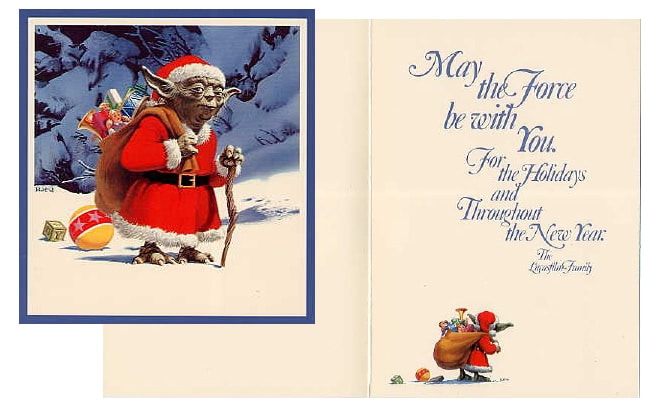 Mais, au risque de vous surprendre, ce Santa Yoda n'est pas une invention sortie de la tête d'un designer de chez LEGO qui aurait décidé de nous gâcher l'existence avec une minifig ridicule. en effet, en 1981, la société Lucasfilm utilisait une carte de voeux officielle (visuel ci-dessous) sur laquelle une dessin de Ralph McQuarrie, illustrateur officiel de l'univers Star Wars, représente un Yoda pas franchement joyeux, mais affublé d'une tenue de Père Noël. Dès lors, il faut se rendre à l'évidence, Santa Yoda est canon et fait bien partie de l'univers de Star Wars, fin de la discussion.