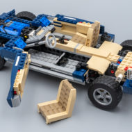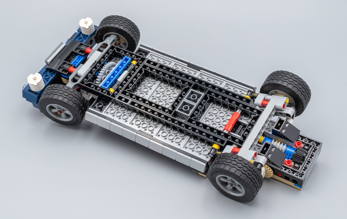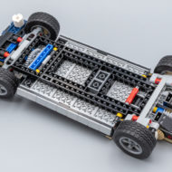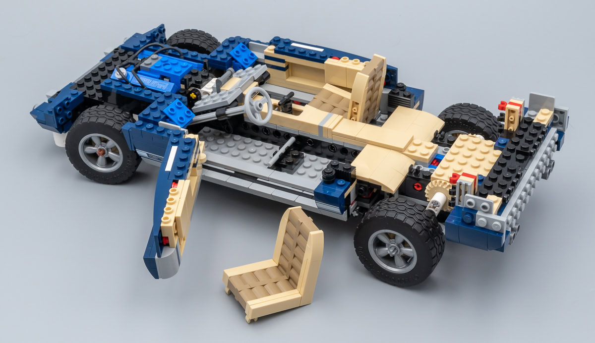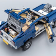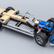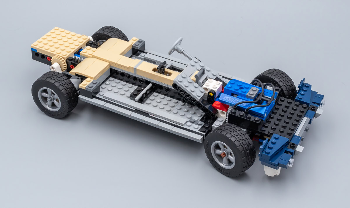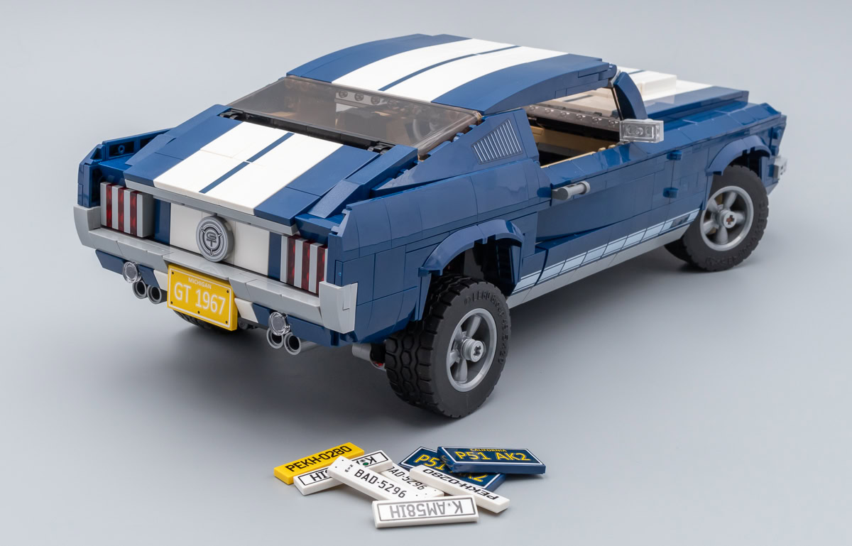 Lorsque la Ford Mustang historique est assemblée, LEGO propose ensuite de personnaliser le véhicule à l'aide de différents éléments pour lui donner un look à la Fast & Furious. Comme indiqué plus haut, vous pouvez d'un seul doigt surélever le train arrière du véhicule. Le designer a pensé à tout et deux panels noirs dissimulent l'intérieur du châssis lorsque la Mustang est dans cette position.
