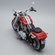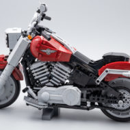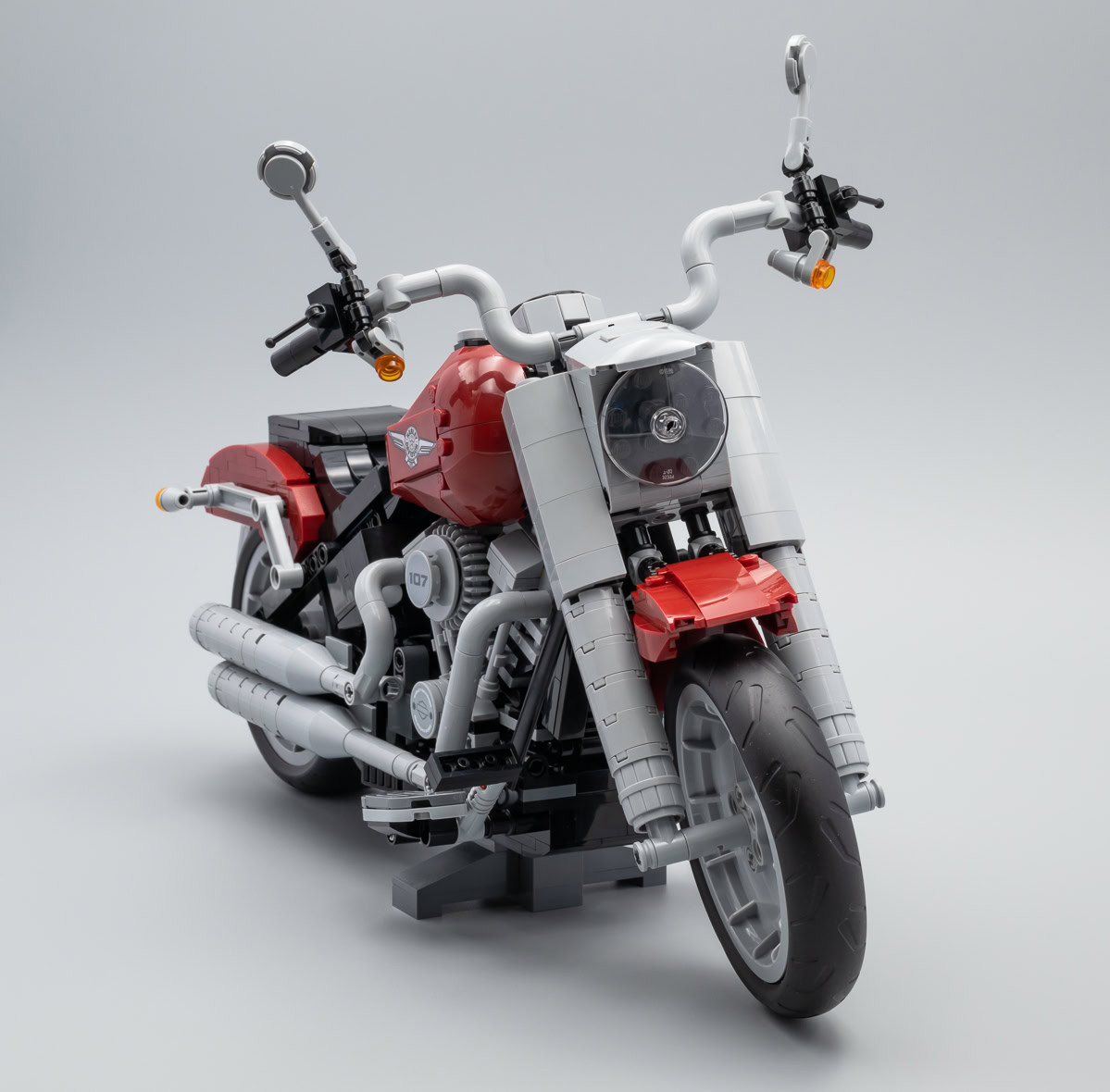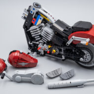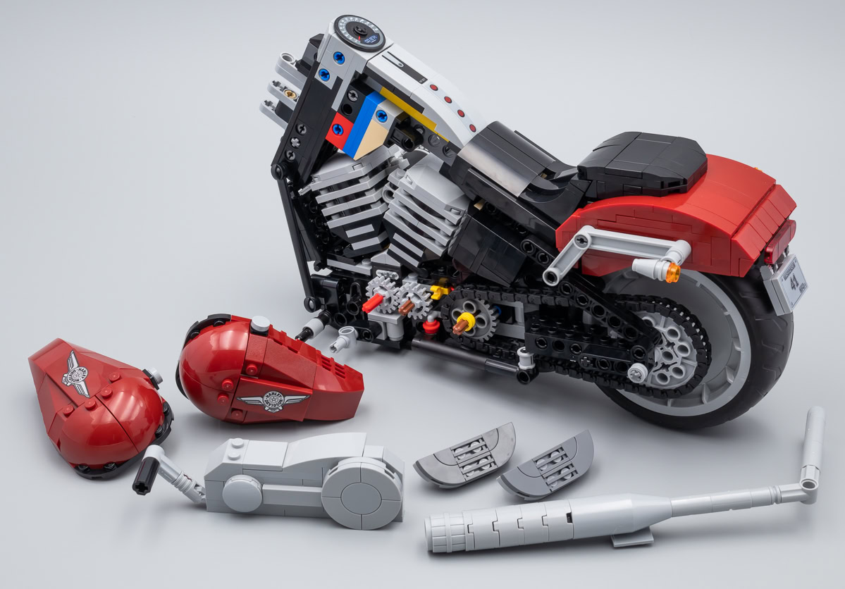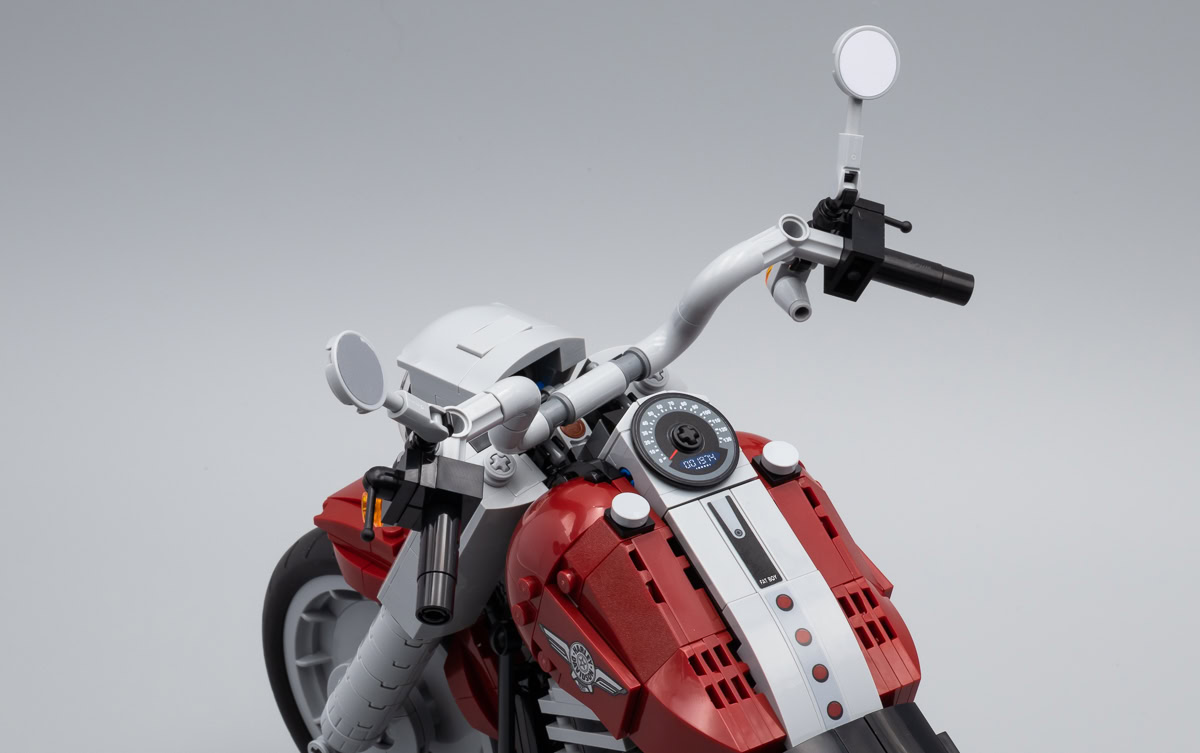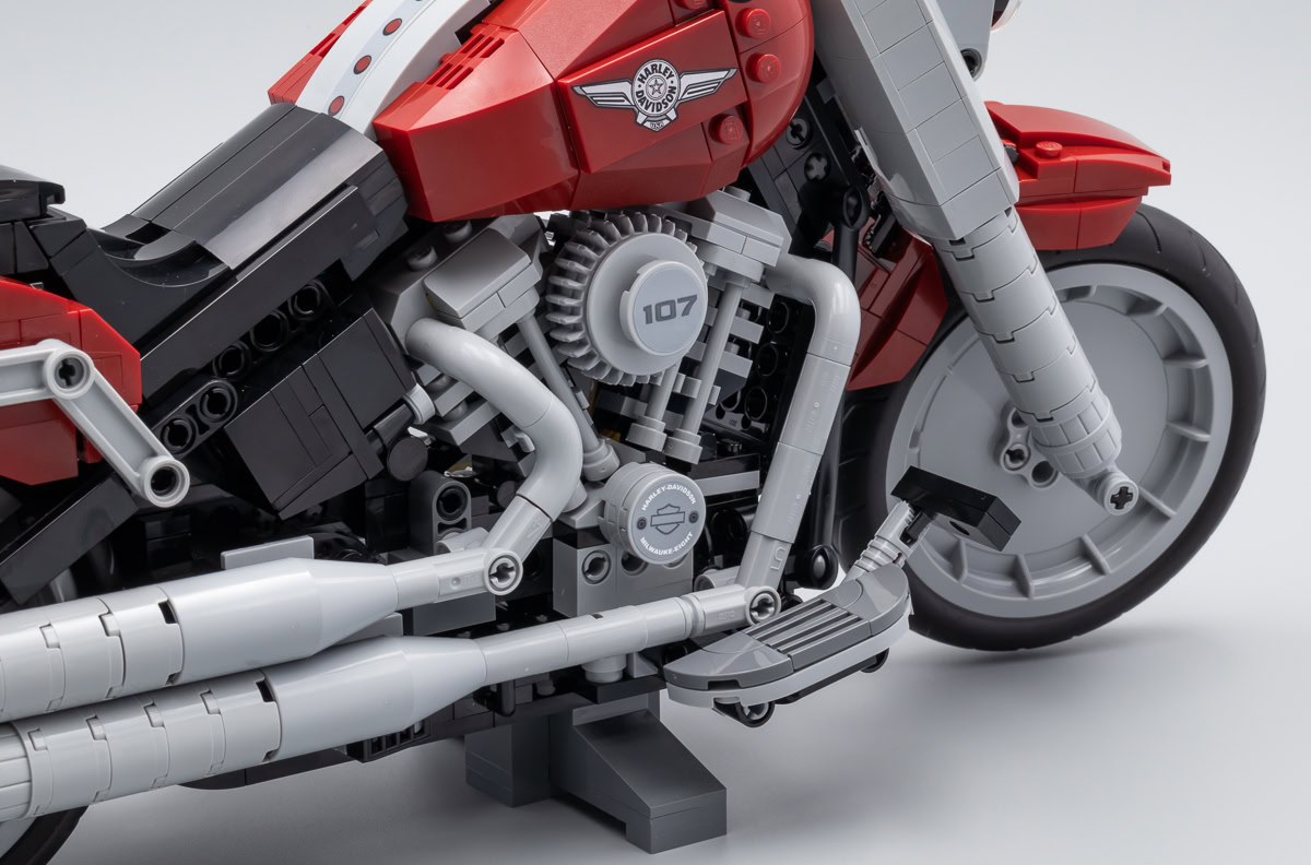 Plus gênant : alors que Harley-Davidson fait généralement la part belle aux chromes sur ses différents modèles, LEGO se contente ici d'un gris clair qui peine un peu à mettre en valeur les différents éléments chromés présents sur le Fat Boy. Ce sont tous ces chromes qui donnent un peu de légèreté à ce modèle Fat Boy tassé et massif. Les jantes pleines en aluminium coulé Lakester en version LEGO sont parfaitement reproduites, mais il leur manque également ce petit reflet satiné qui leur donnerait un côté plus gracieux.