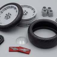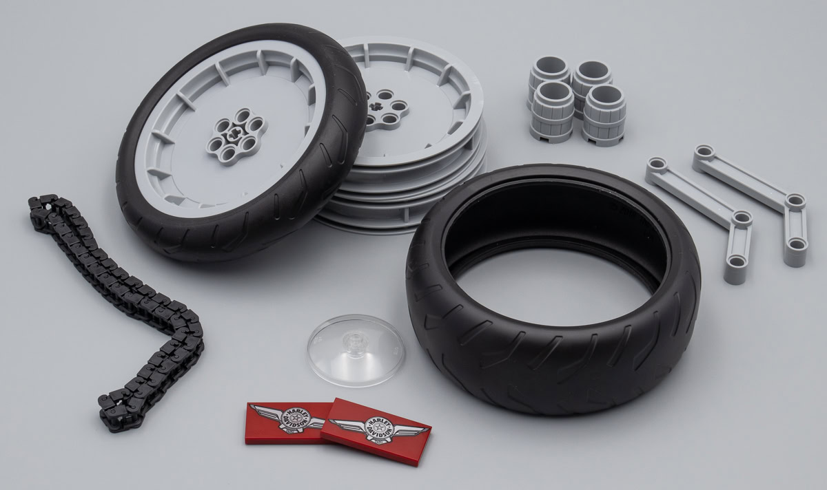 Les logos présents de chaque côté du réservoir sont les seuls éléments du set à être tampographiés. Tous les autres éléments sont recouverts de stickers et pour un produit dérivé d'une marque mythique, c'est quand même dommage. Trois jantes sont fournies, deux entre elles étant couplées pour intégrer le gros pneu arrière.