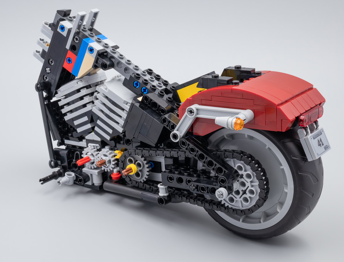 La moto en version LEGO reproduit presque à la perfection le côté massif et agressif de l'engin avec son cadre compact qui englobe tous les éléments du moteur sans laisser d'espace vide. On retrouve bien la fourche massive à l'avant et la courbe qui glisse vers le siège du pilote pour se terminer par le très imposant garde-boue arrière qui surmonte un énorme pneu Michelin de 240.