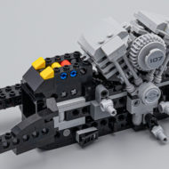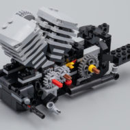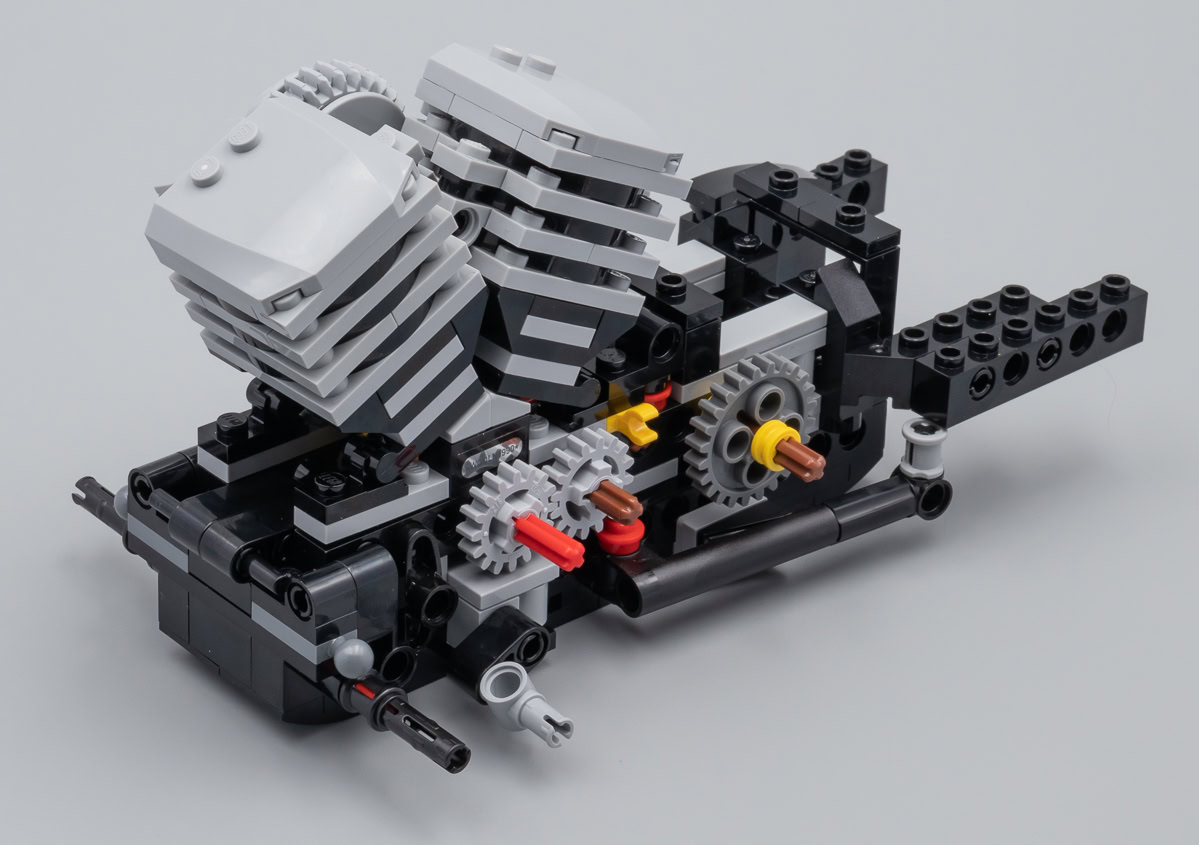 En revanche, difficile d'en vouloir à LEGO d'avoir laissé la chaîne visible alors qu'elle est recouverte d'un carter sur le modèle réel. La seule fonctionnalité du produit étant la mise en mouvement des deux pistons à l'intérieur des cylindres du moteur, il fallait bien laisser un indice visible de la présence de ce mécanisme.