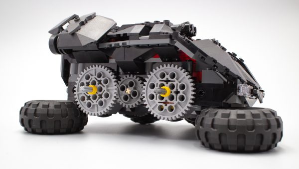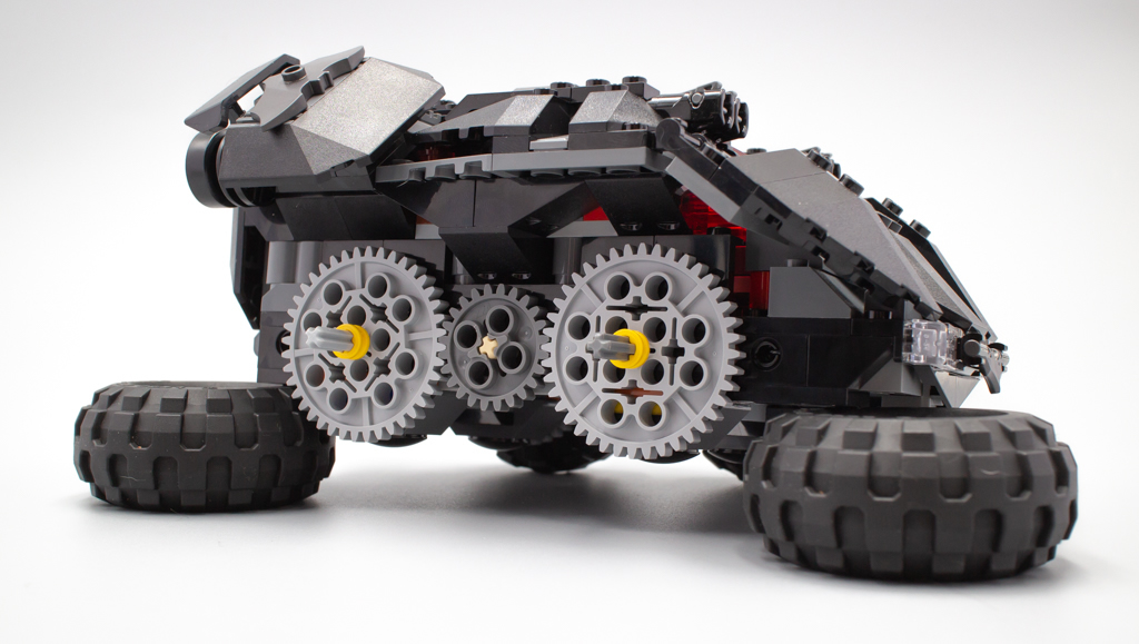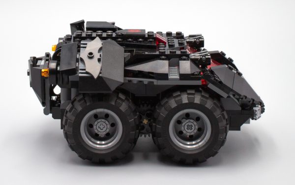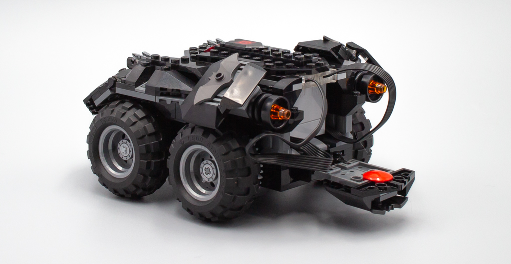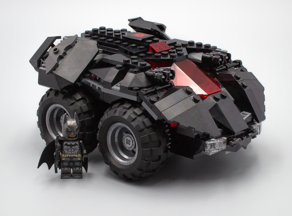 Autant évacuer tout de suite la question qui fâche : Cette Batmobile ne ressemble à rien d'existant dans l'univers DC Comics. Si la minifig (exclusive à ce set) est bien inspirée du jeu vidéo Arkham Knight, le véhicule ne l'est manifestement pas. On dirait plutôt un engin militaire blindé. Les modeurs pourront d'ailleurs facilement s'approprier le châssis de la chose et en faire ce qu'ils veulent, peut-être une vraie Batmobile...
